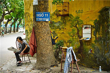 손님을 기다리는 동안 신문을 읽는 베트남의 거리 이발사
